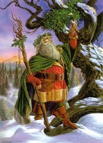 En Scandinavie « le matin de Noël on prend la plus belle gerbe… on la fiche au bout d’une perche… on plante la perche sur le toit (de la plus belle maison) à côté de la cloche de commandement… Ainsi veut-on qu’à l’exemple de l’homme, les oiseaux puissent fêter Yule (34) »… Yule est tout simplement le symbole du solstice d’hiver et la gerbe qui le représente figure la renaissance d’une année pleine de promesses » de l’an nouvel ou Noël (35). Toutes les coutumes d’échanger des cadeaux et de banqueter n’ont pas d’autre signification et même le fait de tuer le cochon à cette époque se rattacherait au « sanglier de Noël en qui s’incarnerait l’esprit du blé » (36). Yule a toujours eu pour centre une sorte d’idole symbolique le figurant. En Angleterre le Yule de Christmas est toujours la bûche de Noël (37) ; si les grandes personnes n’invoquent plus celles-ci, les enfants, plus imaginatifs, s’agenouillent çà et là devant elle pour l’inviter à bien brûler, au besoin en l’arrosant de vin (38). Ailleurs la fête est concrétisée d’une façon plus anthropomorphique, par une gerbe, par exemple, comme nous l’avons vu plus haut ; cette gerbe en Suède s’appelle le Vieil homme d’Yule (39) et on lui donne vaille que vaille une silhouette d’homme ou de femme, voire de chèvre ou de coq. Notons en passant que ce joue un certain rôle pendant notre fête ; immolé en Laponie (40) pendant les beuveries du Joulu, dans d’autres pays, au Danemark par exemple, « quand arrive le moment où l’on célèbre la naissance du Christ, l’oiseau de l’aube chante toute la nuit » (41). A l’emblème de fécondité, que symbolise la gerbe, se rattache aussi l’idée du recouvrement de la vie végétale, du renouveau de la verdure et la vieille coutume de l’Arbre de Noël, idole naturelle de la fête, procède de cette idée. On sait quel rôle a joué l’arbre, probablement le premier domicile de l’homme, dans la religion des peuples. Sans parler de la passion qu’ont certains artistes pour les arbres, la mystique rationnelle du reboisement n’est pas sans se rattacher au vieux culte de ces êtres bienfaisants. Comme c’est le cas dans toutes les légendes un peu généralisées, l’origine de l’arbre de Noël doit être multiple. Le dieu Atlys, autre précurseur de Jésus, était déjà un pin et le culte de l’arbre figurait en bonne place dans les mystères du Dieu Mithra dont le Christ a usurpé jusqu’au jour de la naissance (42). Toutefois c’est dans les grandes forêts de l’Europe océanique qu’il faut chercher