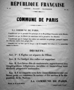 Le 18 mars 1871 débute un soulèvement appelé « la Commune de Paris ». Chacun connaît la part prise par les libres penseurs. Cette révolution prolétarienne, la plus authentique, avant celle de 1917, a marqué le mouvement ouvrier par ses idées, par ses réalisations. En moins de 3 mois, ces femmes et hommes révolutionnaires de toutes tendances, essentiellement des ouvriers, des artisans, des petits commerçants, des écrivains et artistes, fervents défenseurs de l’égalité et de la liberté, mirent au point un programme, qui devait changer la face du monde. La Commune de Paris, acte historique, devient une référence dans la conscience ouvrière et ouvre la voie à d’autres peuples dans leur combat pour leur pleine émancipation.
