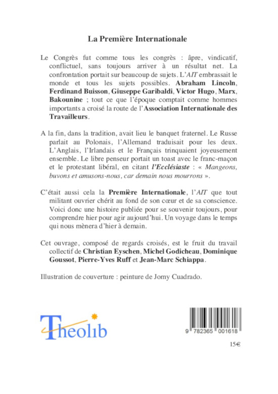 Christian Eyschen, Michel Godicheau, Dominique Goussot, Pierre-Yves Ruff et Jean-Marc Schiappa traitent et analysent Karl Marx, Michel Bakounine, la Franc-Maçonnerie, la Libre Pensée, les syndicats ouvriers, les Protestants libéraux à l’aune de leurs rencontres avec l’Association internationale des Travailleurs.