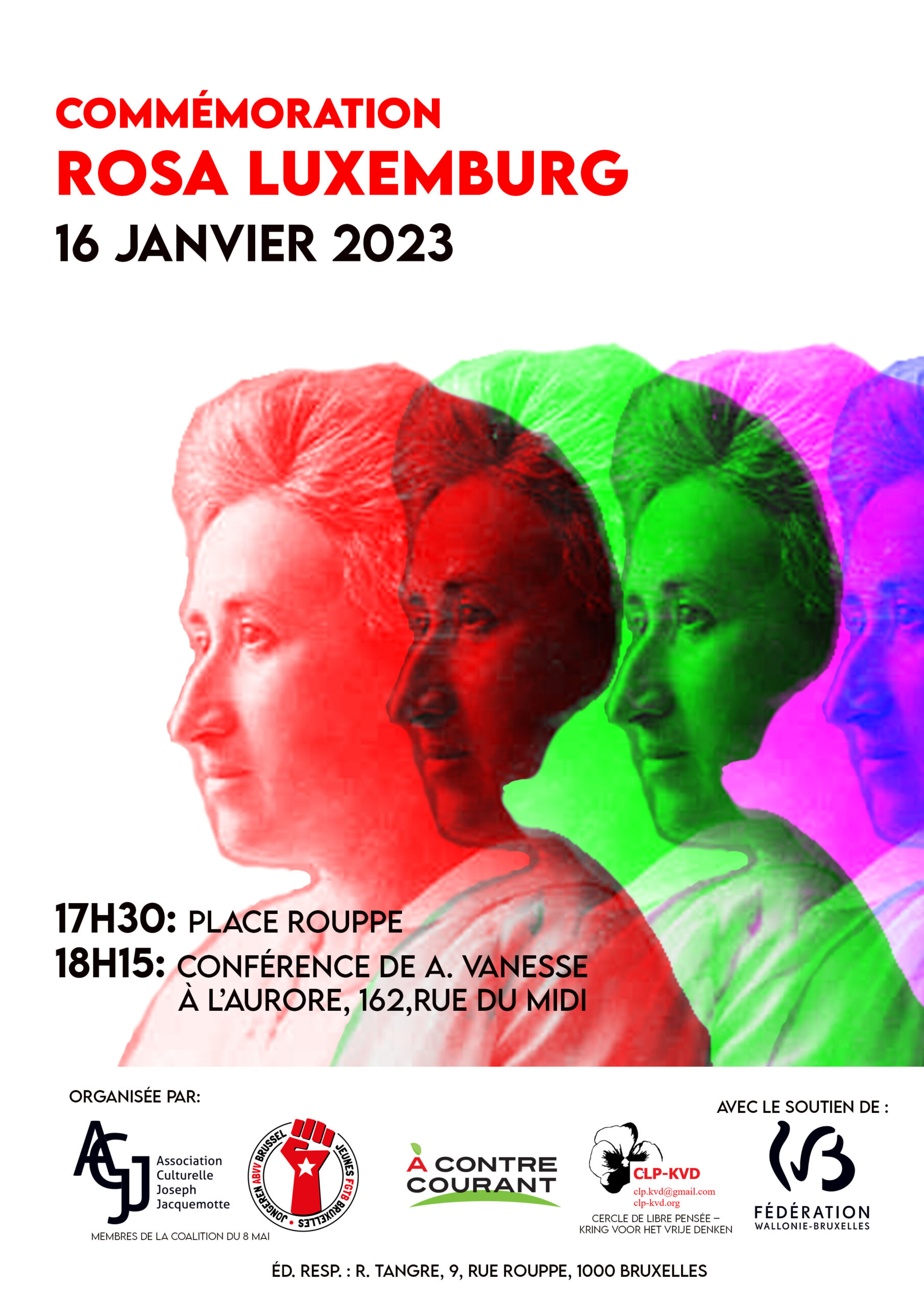 À la suite du dépôt de fleurs, à 18:15, vous êtes tous et toutes invité-e-s à la conférence d’Anne Vanesse sur Rosa Luxemburg à deux pas de l’événement, à l’Aurore.