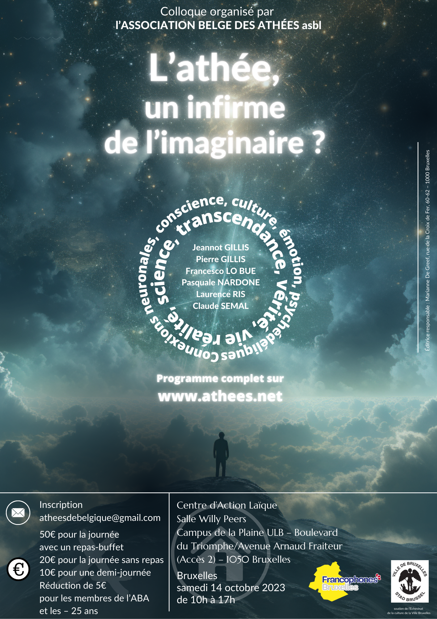Nos amis de l’Association Belge des Athées (ABA) organise chaque année un colloque. Le colloque de cette année aura comme thème « L’athée, un infirme imaginaire ? » et se déroulera le samedi 14 octobre de 10h à 17h à Bruxelles dans les locaux du CAL, Campus de la Plaine ULB.