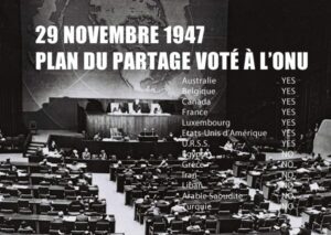 Le 29 novembre 1947, l’Assemblée générale des Nations-Unies, qui détient encore un pouvoir de décision ultérieurement réservé au seul Conseil de sécurité, adopte le plan de partage de la Palestine, entérinant ainsi le processus de division de ce pays engagé dès la Première Guerre mondiale. Trente-trois États sur cinquante-six votent en sa faveur, y compris le représentant de l’Union soviétique qui s’écarte ainsi de la position des Bolchéviques de 1917 considérant le partage comme une atteinte au droit à l’autodétermination des Palestiniens. Semyon Tsarapkin déclare notamment : « Les arguments historiques et juridiques ne peuvent pas et ne doivent pas être décisifs dans le règlement de la question palestinienne. Le problème a pour base essentielle le droit des populations juives et arabes de Palestine à décider de leur sort. Les souffrances subies par les Juifs au cours de la dernière guerre doivent constituer un élément important dans la décision de l’Assemblée. Les Juifs luttent pour un État qui leur soit propre, et il serait injuste de leur refuser le droit d’atteindre cet objectif. »