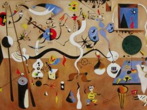 Expériences des sommeils, avec Desnos, expériences d’automatisme, de plongée dans l’inconscient… Ainsi le Carnaval d’Arlequin, de Joan Miro, tout en proposant un ensemble spatial construit, permet à des créatures qui semblent venues des rêves de l’enfance de vaquer à des occupations parfaitement étrangères à tout esprit d’utilité ou d’imitation du réel (notre reproduction). Avec André Masson, figure centrale à l’époque pour les peintres surréalistes, on est au plus près de l’automatisme, en particulier dans les dessins. Ses portraits des poètes surréalistes, très inspirés, sont célèbres. Masson tente d’introduire l’automatisme, donc la dictée de l’inconscient, dans la peinture. Il sera d’ailleurs très vite conscient des difficultés : peindre n’implique pas des gestes aussi rapides et libres que dessiner. Il représente alors à ce moment la puissante synthèse des expériences passées, comme le cubisme, et de l’esprit réellement nouveau que représente l’écoute de l’inconscient dans le surréalisme.